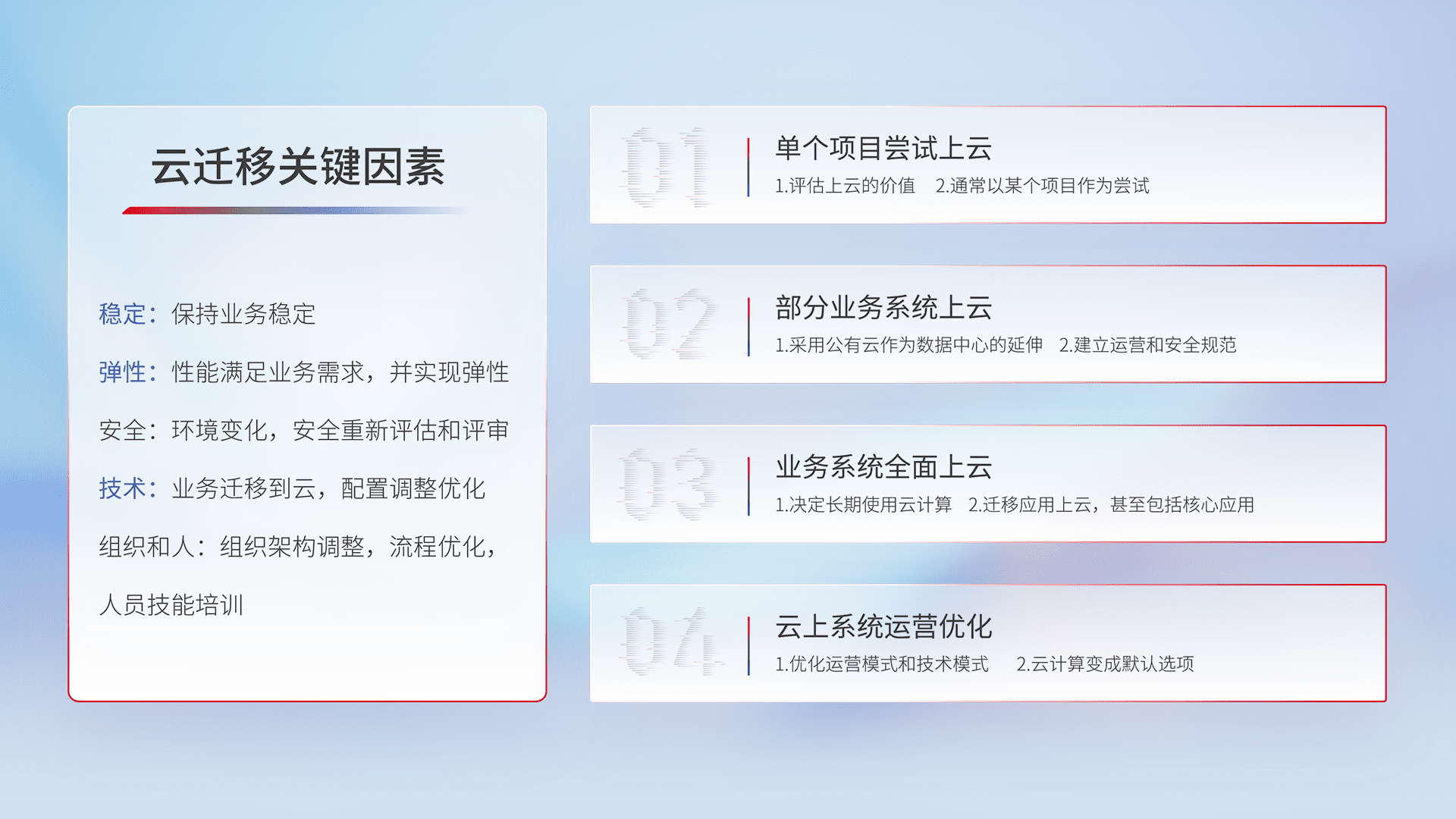 结合实际业务,,,从规划设计、、、、云平台选型、、、云原生改造、、、数据迁移、、、集成交付,,,迁移全过程为客户识别最佳上云路径,,做好风险识别管理,,,,设计网络架构、、、、身份权限、、安全审计合规、、、、操作审计、、、日志审计、、、、监控告警策略、、、多站点容灾设计等,,,对云上基础设施进行整体规划,,,提升IT治理水平,,,,以满足弹性、、、、高可用、、高性能的需求。。。。
