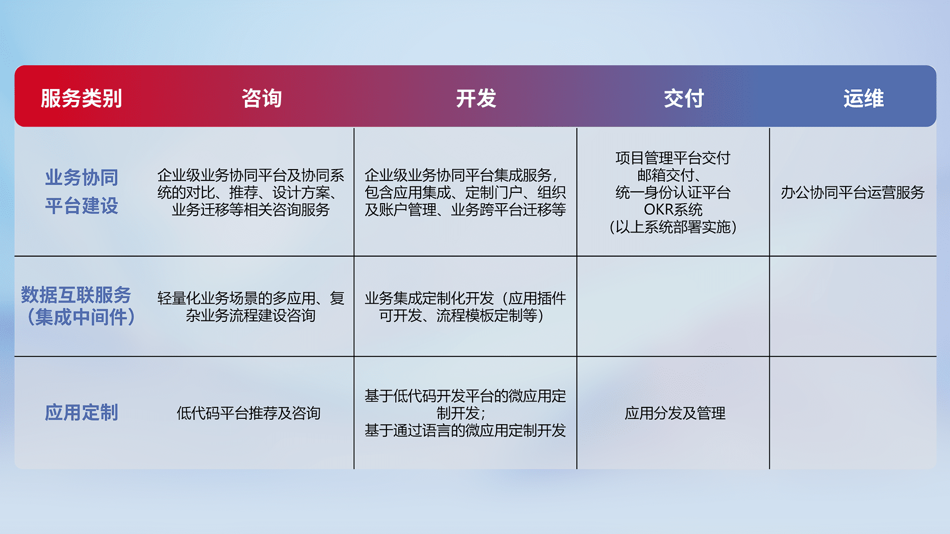 针对钉钉、、企微、、、、IDaas等平台级产品提供产品的规划、、、、方案、、、交付、、定制化开发等服务,,,实现如统一协同办公、、智能客户服务、、、、混合会议管理、、、智能数据查询、、、、等业务场景,,,实现数字化转型。。。